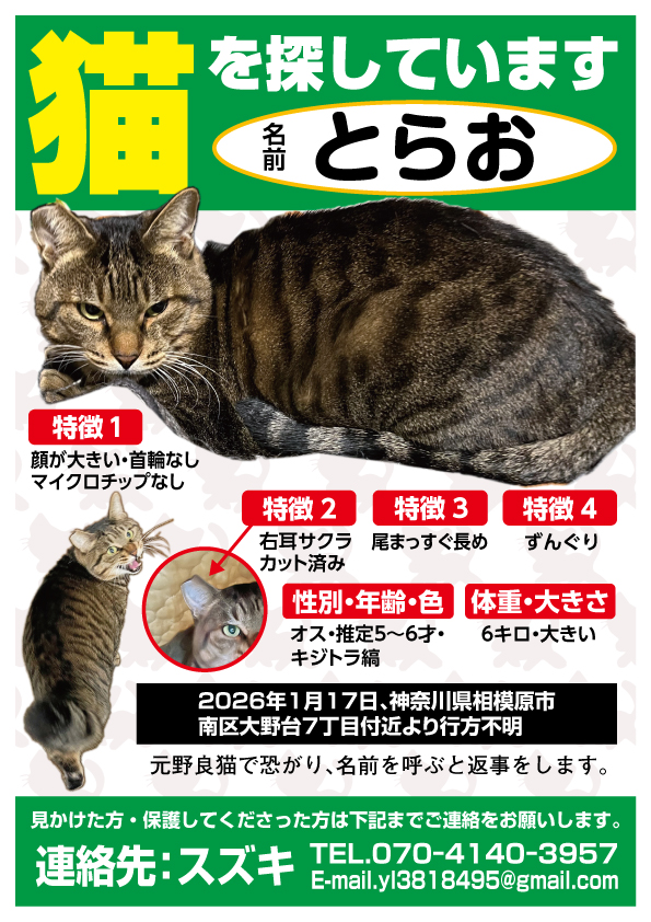 猫(名前 とらおくん)を探している方がいらっしゃいます。